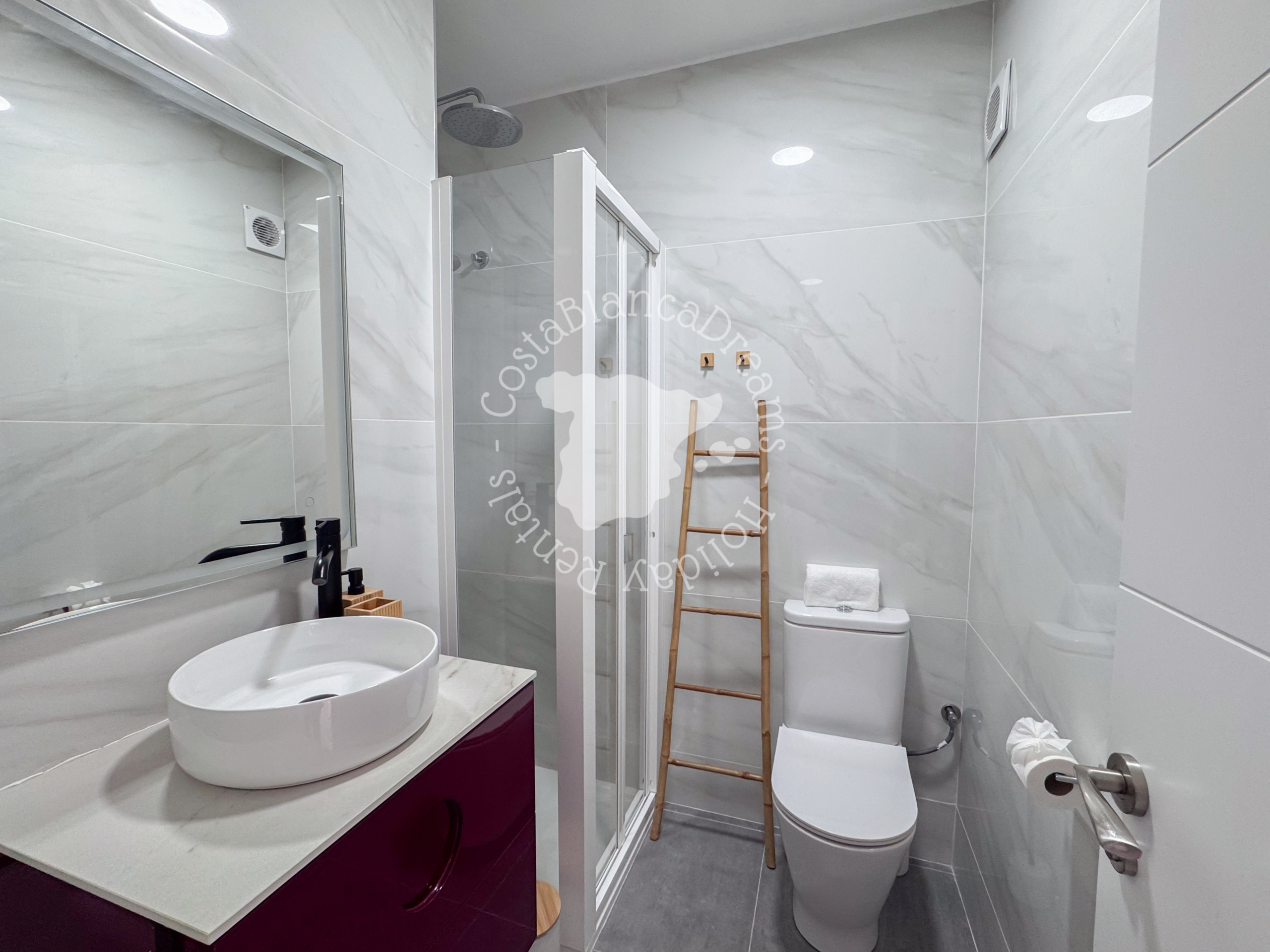 Au bout du couloir se trouvent deux chambres confortables, chacune avec un lit double, une armoire et un ventilateur de plafond (attention : elles ne sont pas climatisées). La salle de bain moderne comprend une douche, un lavabo et des toilettes : tout le nécessaire pour un séjour confortable. Pour les amoureux du soleil, la terrasse privée sur le toit offre une vue imprenable sur Calpe et la mer Méditerranée. Détendez-vous sur les deux chaises longues et profitez du calme et de l'intimité.