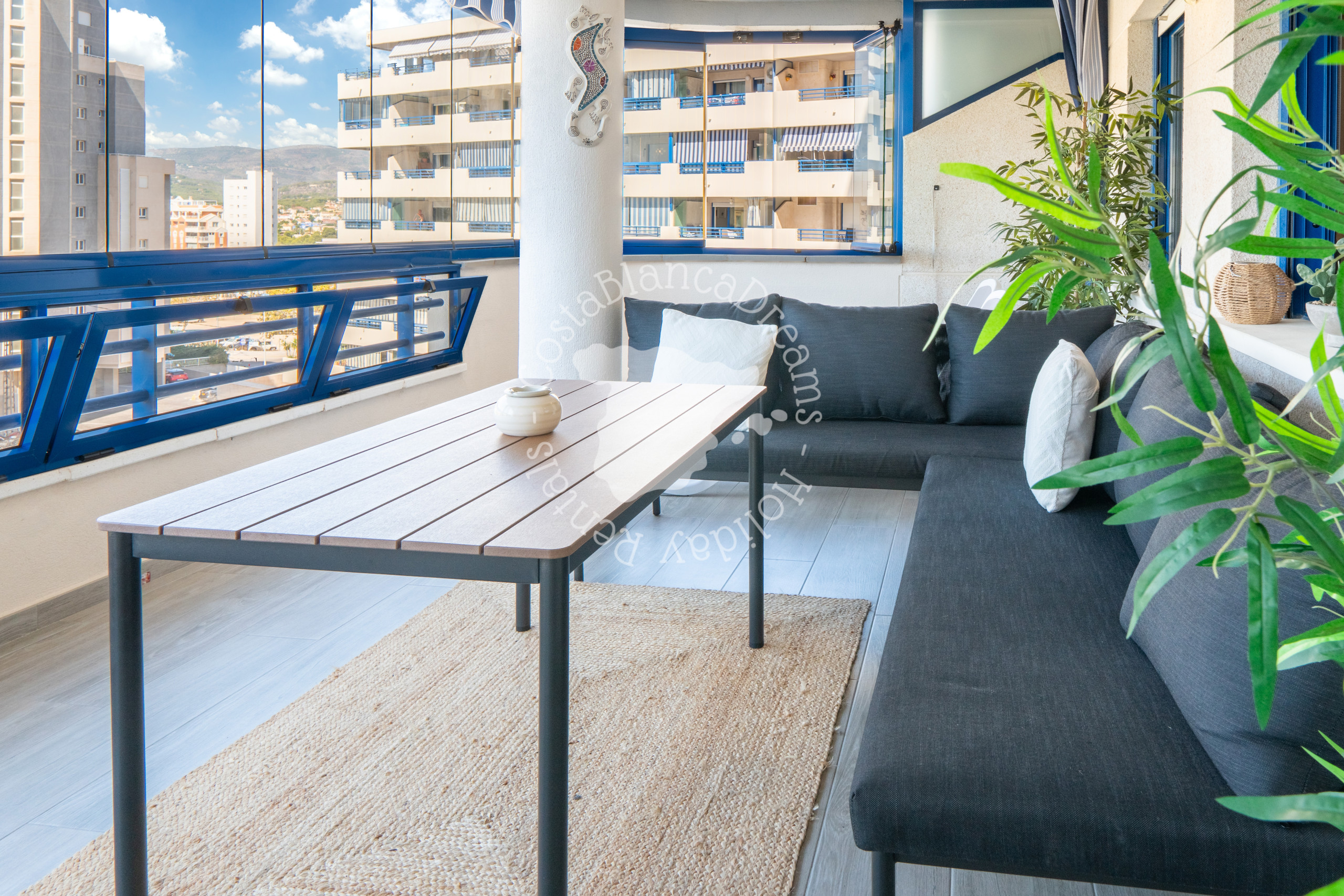 Sortez du salon sur le grand balcon privé, meublé d'une table à manger et de deux transats. C'est l'endroit idéal pour profiter du soleil méditerranéen tout en admirant la vue panoramique sur l'emblématique Peñon d'Ifach, la silhouette de la ville de Calpe, le lac salé Les Salines et la mer scintillante.