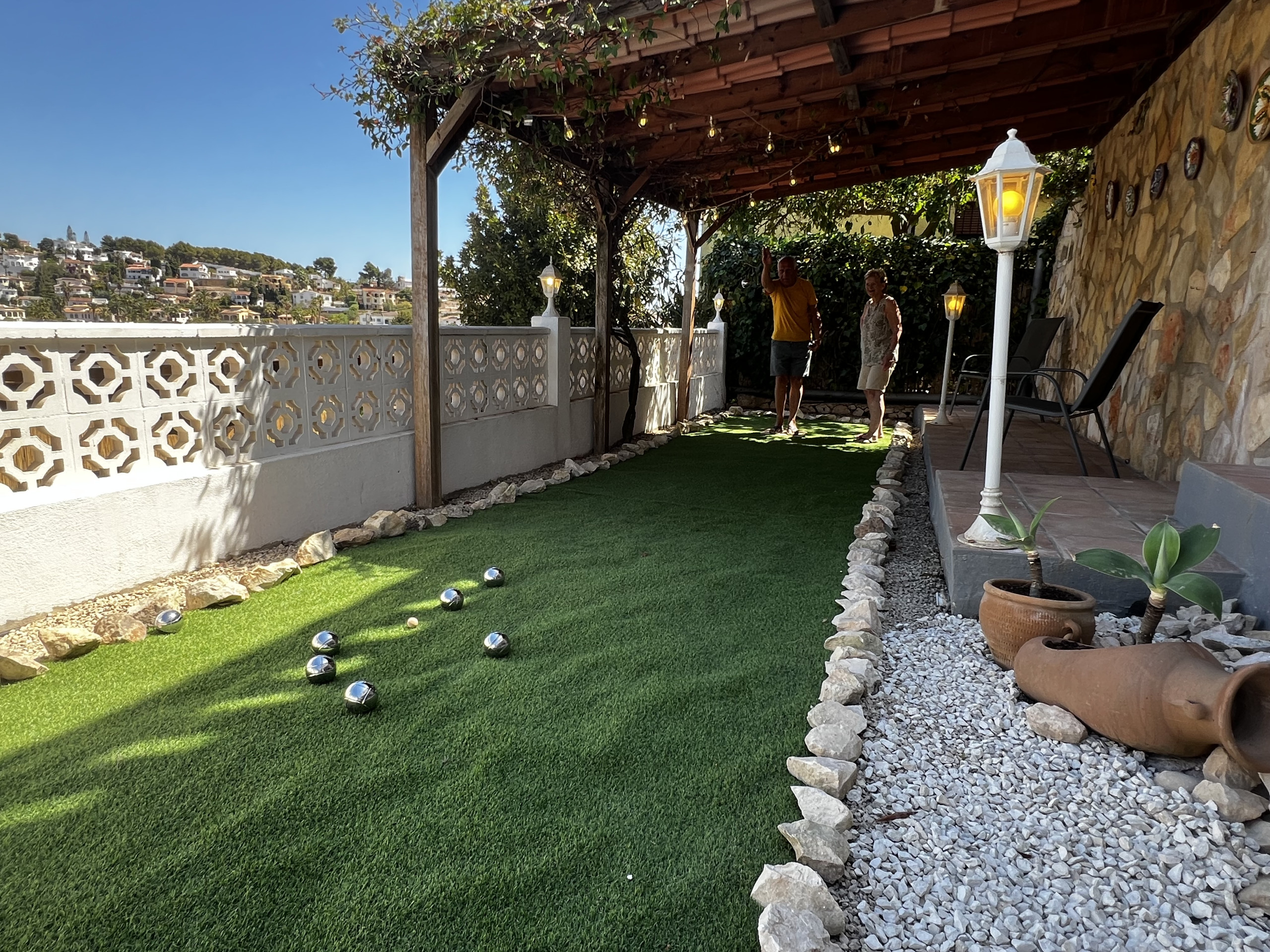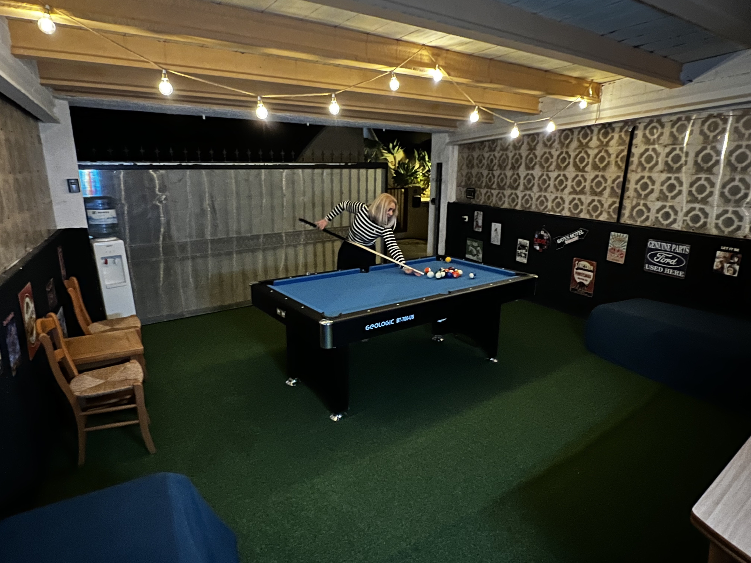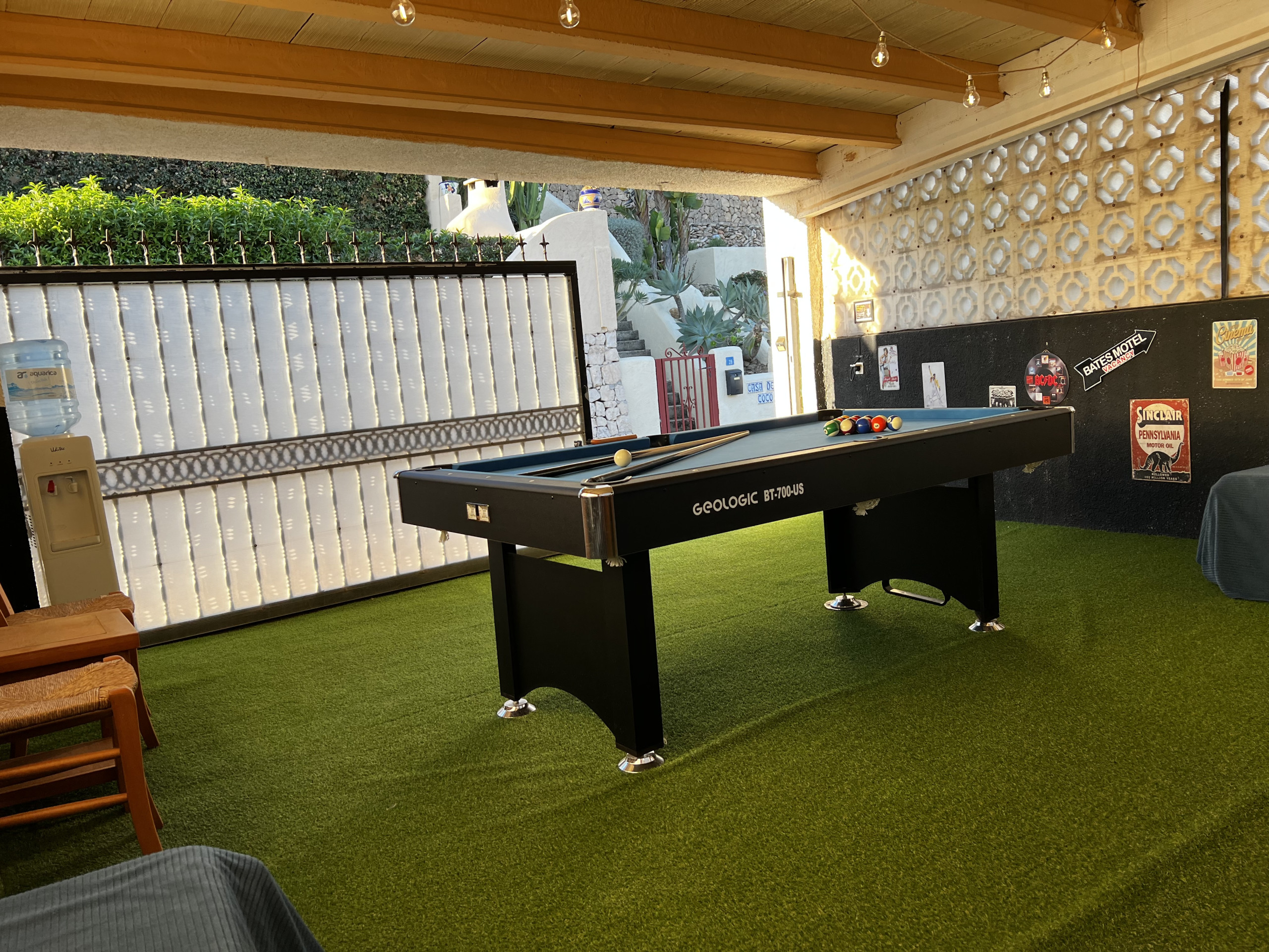 Pour vos loisirs, l'espace extérieur propose plusieurs activités, dont la pétanque, le ping-pong et le jeu de lancer de sacs de maïs. Un garage aménagé fait office de salle de jeux conviviale avec un billard. Que ce soit pour se détendre au bord de la piscine, dîner en plein air ou profiter des terrasses, l'extérieur de la villa offre intimité et plaisir à tous.