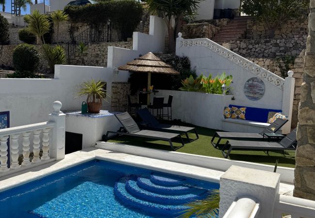 À l'extérieur, le jardin magnifiquement entretenu instaure d'emblée une ambiance de vacances décontractée. La piscine (8 x 4 m) est le cœur de l'espace extérieur, entourée de transats et de coins ombragés où vous pourrez vous détendre et profiter du soleil espagnol.