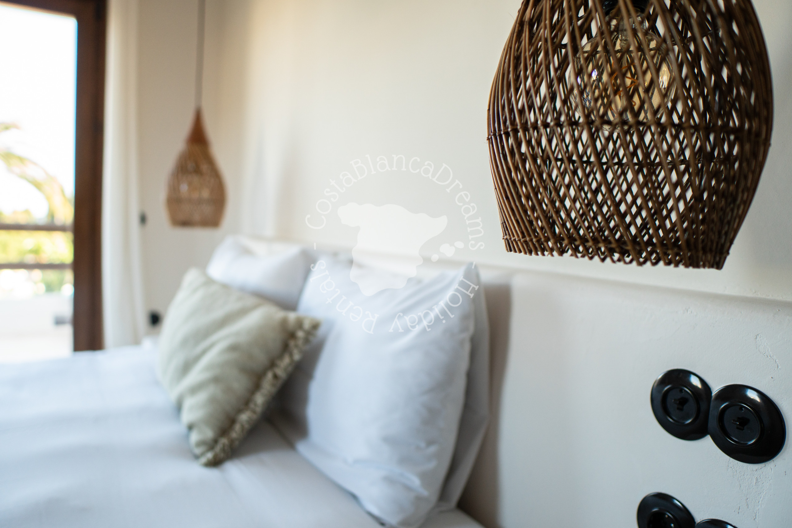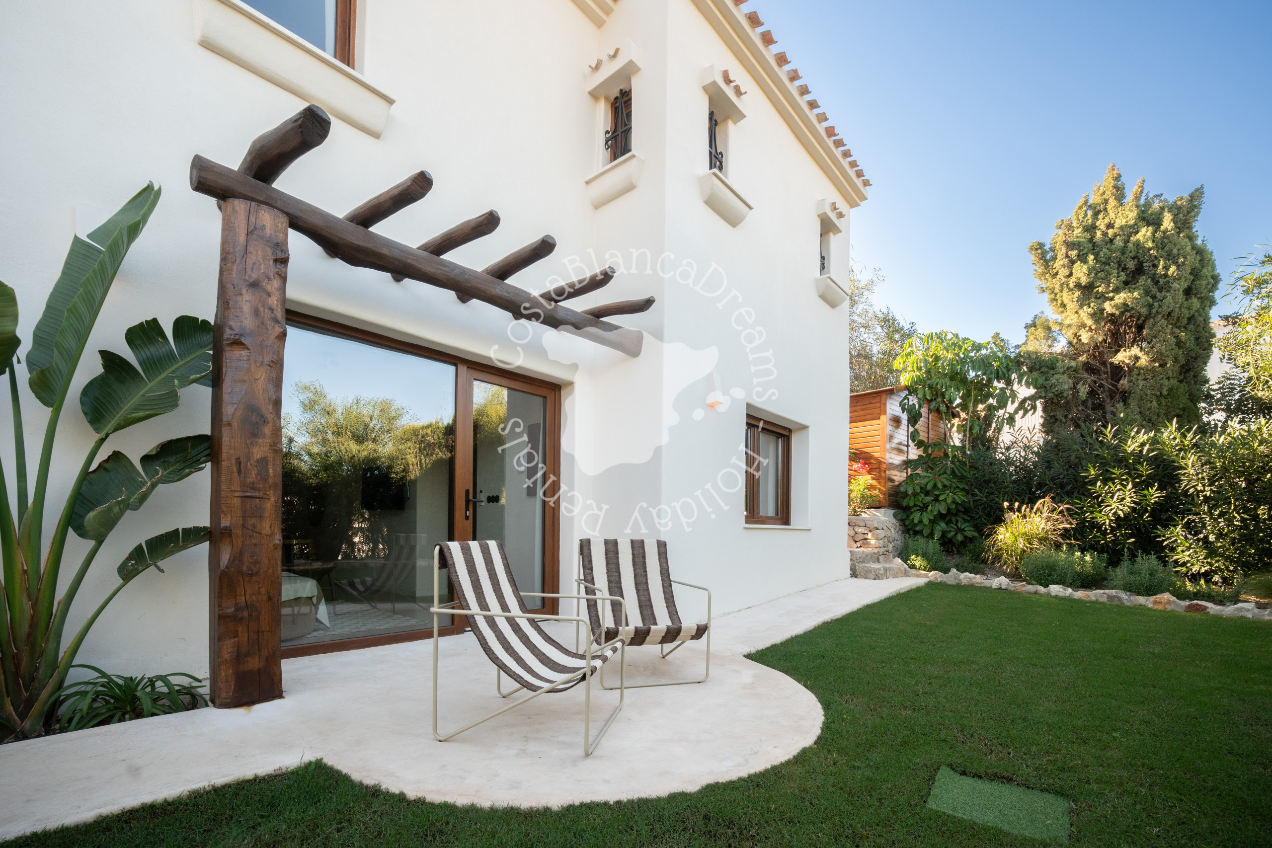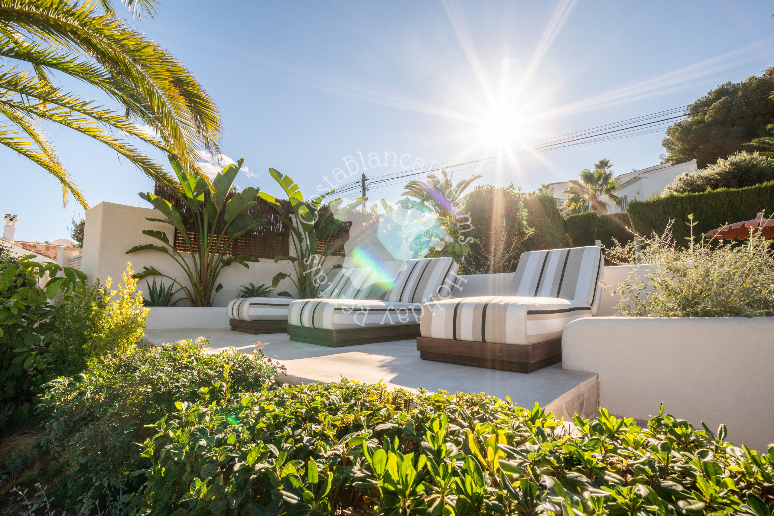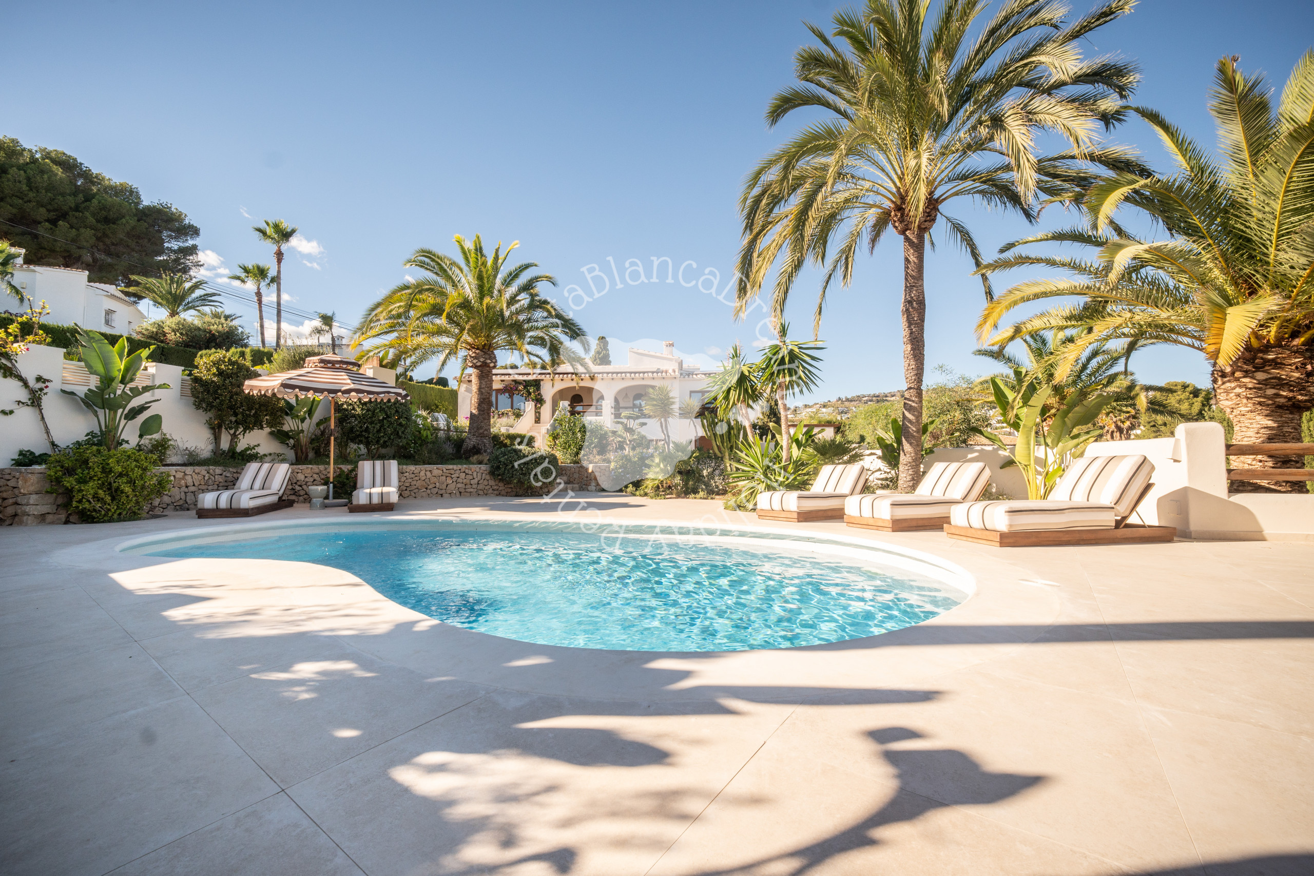 À l'extérieur, vous découvrirez un jardin luxuriant d'inspiration méditerranéenne, agrémenté de palmiers, de cactus et de plantes indigènes. Au cœur de la villa se trouve une piscine de 9 x 5 mètres (chauffage disponible sur demande – voir détails ci-dessous), bordée de chaises longues et d'espaces détente paisibles. Détendez-vous sur le canapé rond, idéal pour des soirées relaxantes sous les étoiles, ou organisez des réceptions intimes sous le pavillon romantique, qui peut même être utilisé pour de petites cérémonies de mariage.