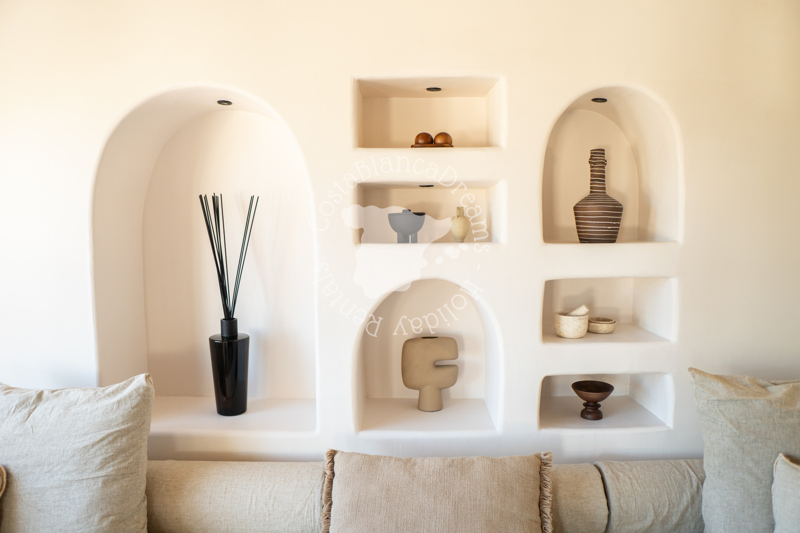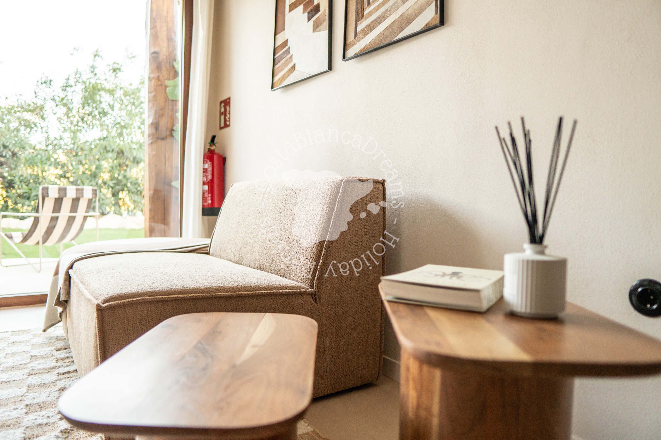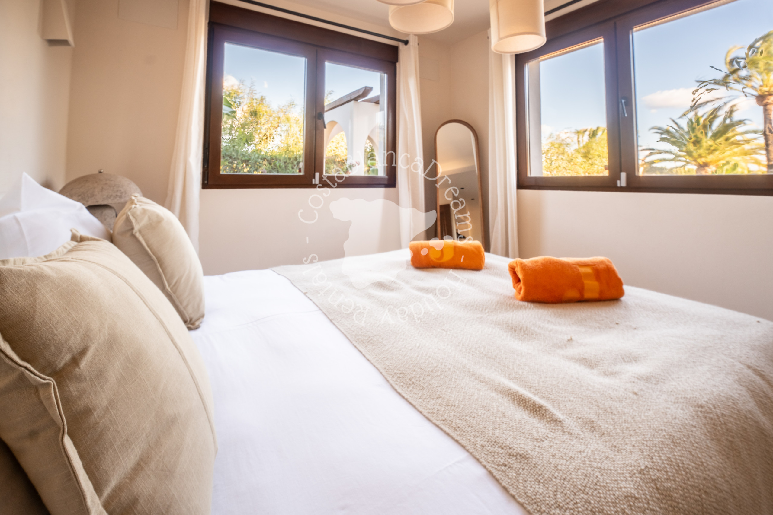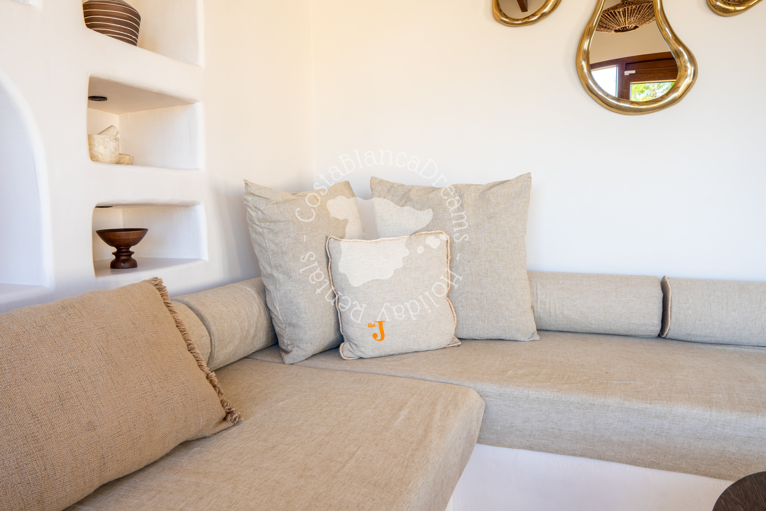 À l'extérieur, vous découvrirez un jardin luxuriant d'inspiration méditerranéenne, agrémenté de palmiers, de cactus et de plantes indigènes. Au cœur de la villa se trouve une piscine de 9 x 5 mètres (chauffage disponible sur demande – voir détails ci-dessous), bordée de chaises longues et d'espaces détente paisibles. Détendez-vous sur le canapé rond, idéal pour des soirées relaxantes sous les étoiles, ou organisez des réceptions intimes sous le pavillon romantique, qui peut même être utilisé pour de petites cérémonies de mariage.