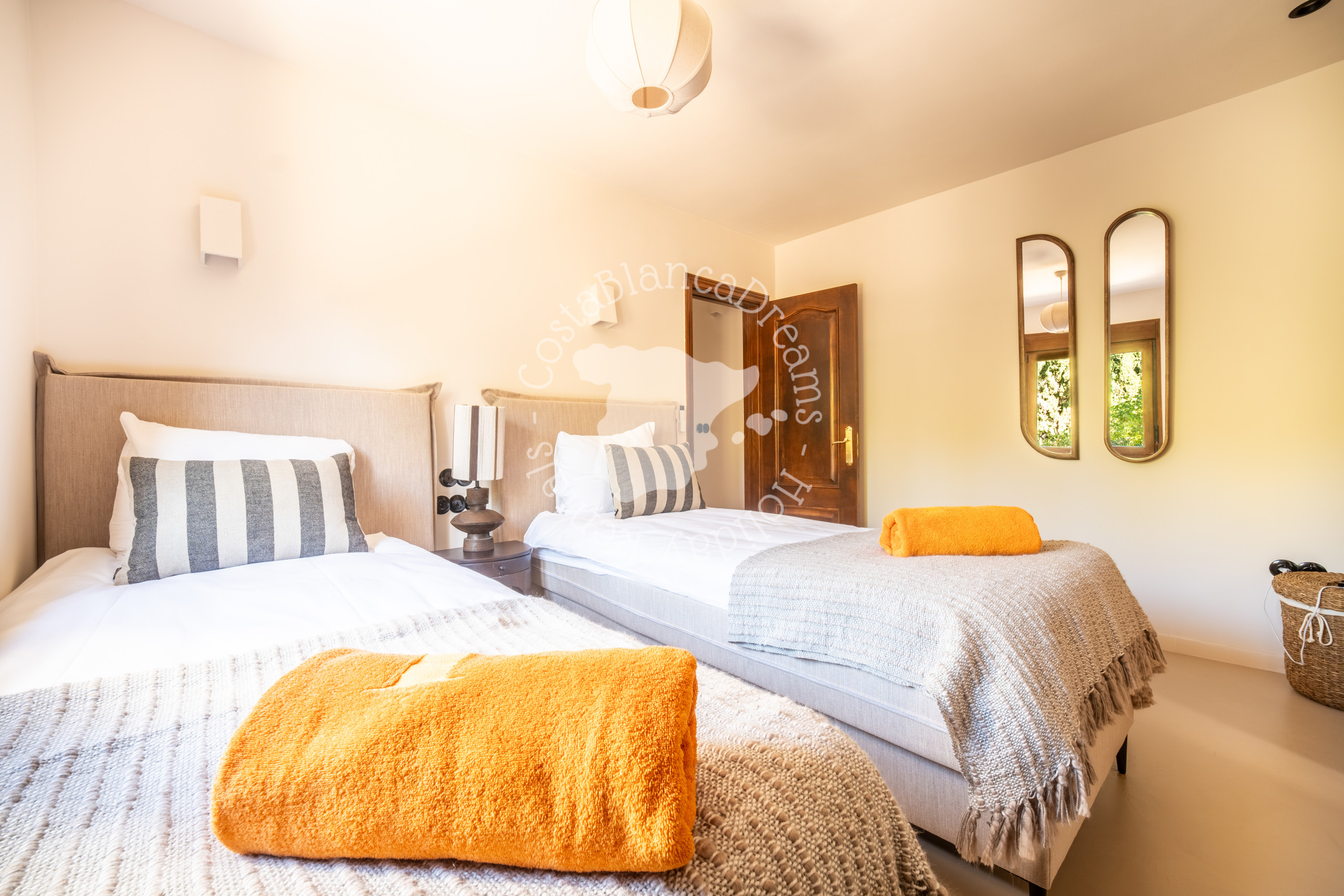 Les chambres sont équipées de 2 lits simples Auping de luxe, les salles de bains sont toutes équipées d'un grand lavabo, d'une douche à l'italienne et de toilettes. La salle de bain principale dispose également d'une grande baignoire. Vous trouverez une chambre et une salle de bains au rez-de-chaussée ainsi que des toilettes invités et les 4 autres chambres et 3 salles de bains à l'étage supérieur.