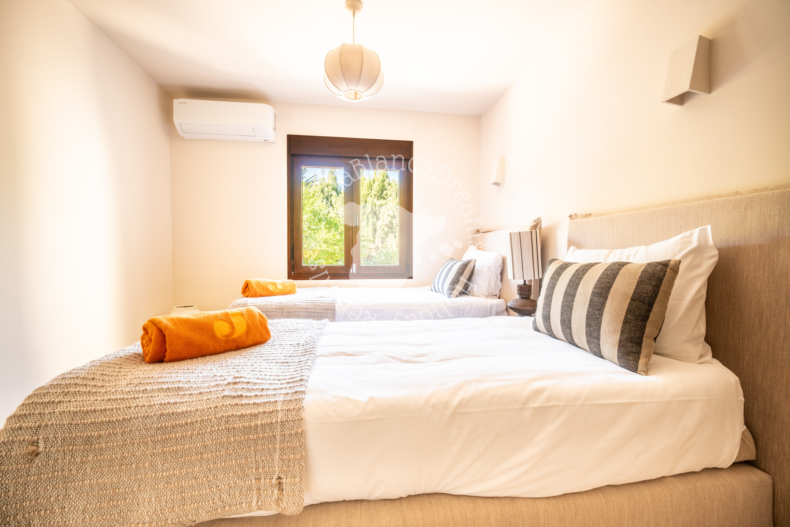 Au bout du couloir, vous trouverez trois chambres climatisées. Deux sont équipées de lits doubles et partagent une salle de bain avec douche, tandis que la troisième offre deux lits simples et sa propre salle de bain, également avec douche.
