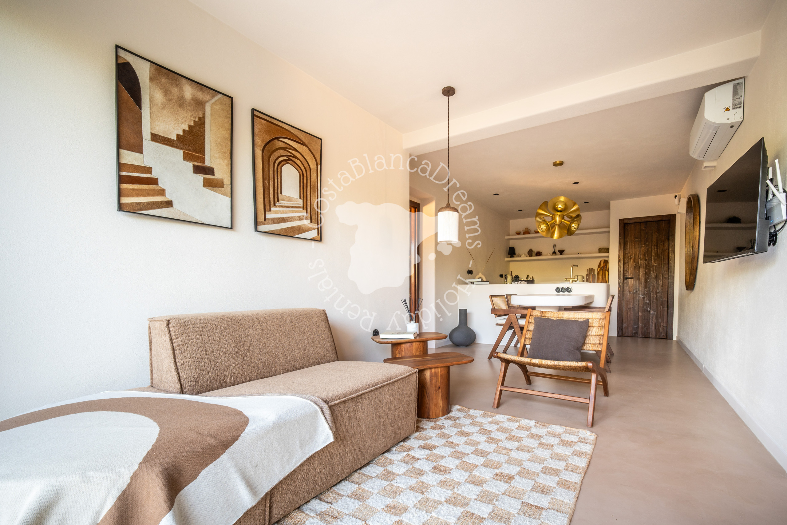 Accédez à la villa par l'escalier extérieur menant à une naya couverte avec table à manger, barbecue Green Egg et vue partielle sur la mer. À l'intérieur, la pièce de vie principale comprend un canapé confortable, une Smart TV, la climatisation et un coin repas. La cuisine entièrement équipée dispose de tout le nécessaire : réfrigérateur, congélateur, plaque à induction, four, micro-ondes, grille-pain, bouilloire et machine Nespresso.