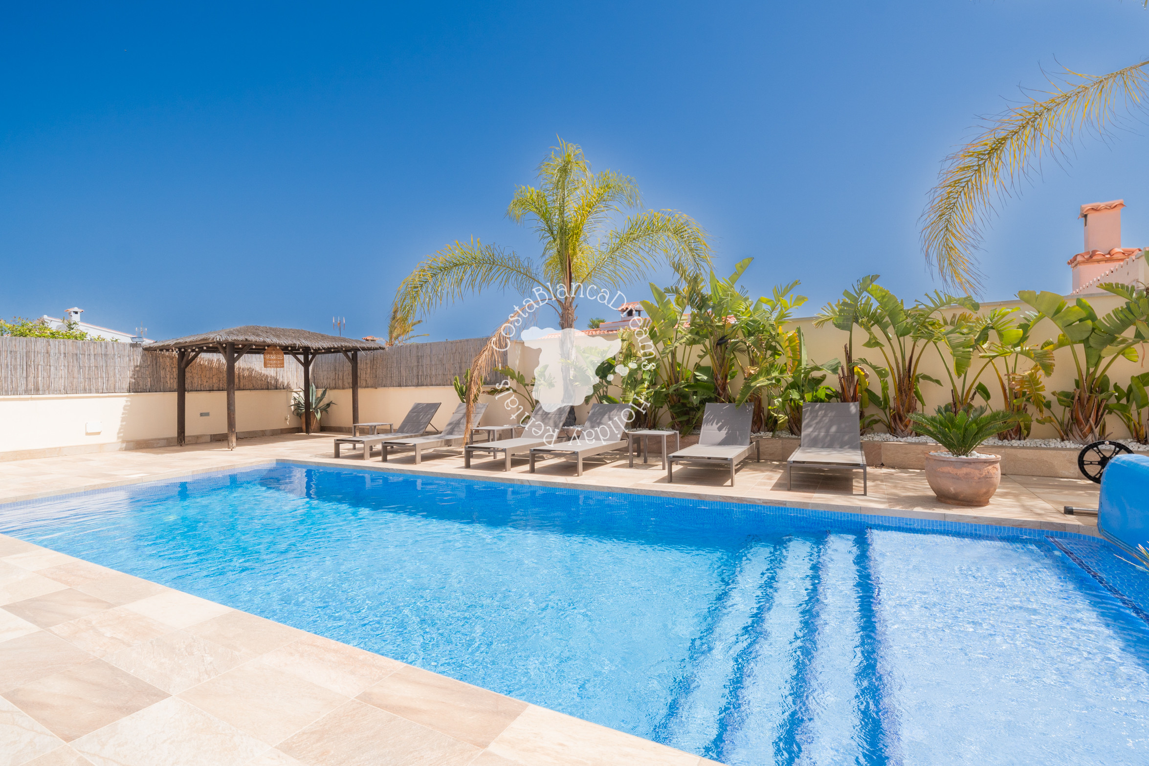 Détendez-vous au bord de la piscine privée (8x4m), détendez-vous et détendez-vous sur l'un des transats. Et pour un peu plus de luxe, vous pouvez utiliser la cuisine extérieure, le barbecue au charbon de bois et il y a des toilettes supplémentaires pour que vous n'ayez pas à traverser la maison tout le temps. Vous pourrez rafraîchir le linge avec le lave-linge privé. Le jardin est entièrement clôturé et vous avez accès à votre parking privé grâce à un portail automatique.