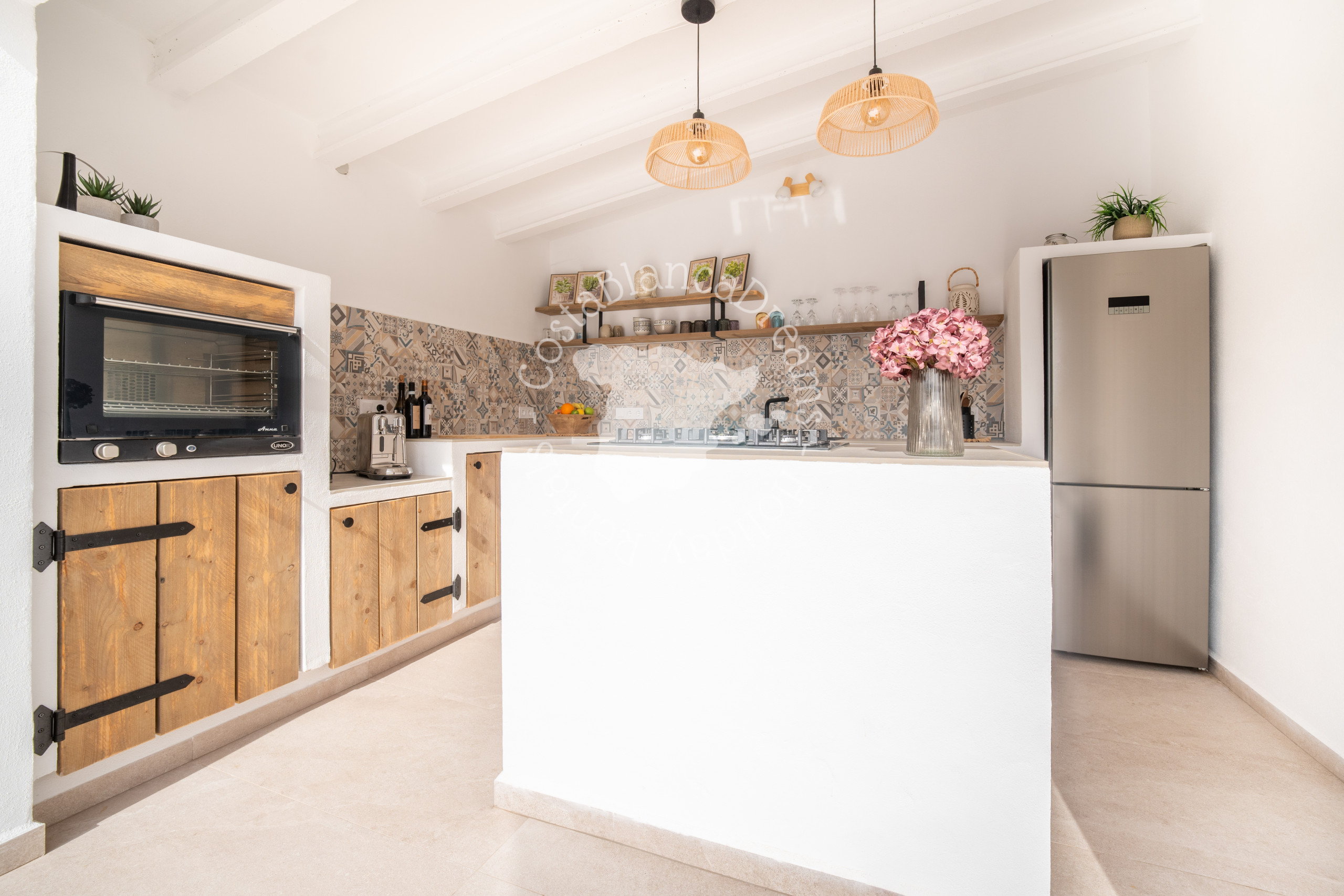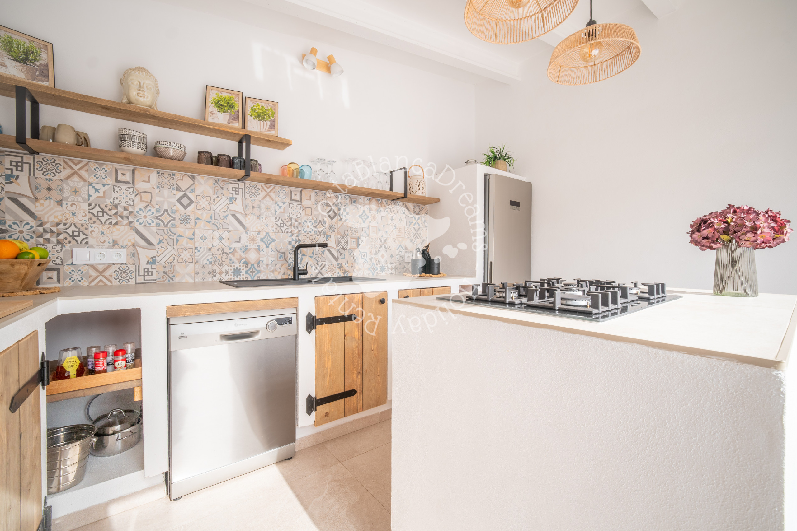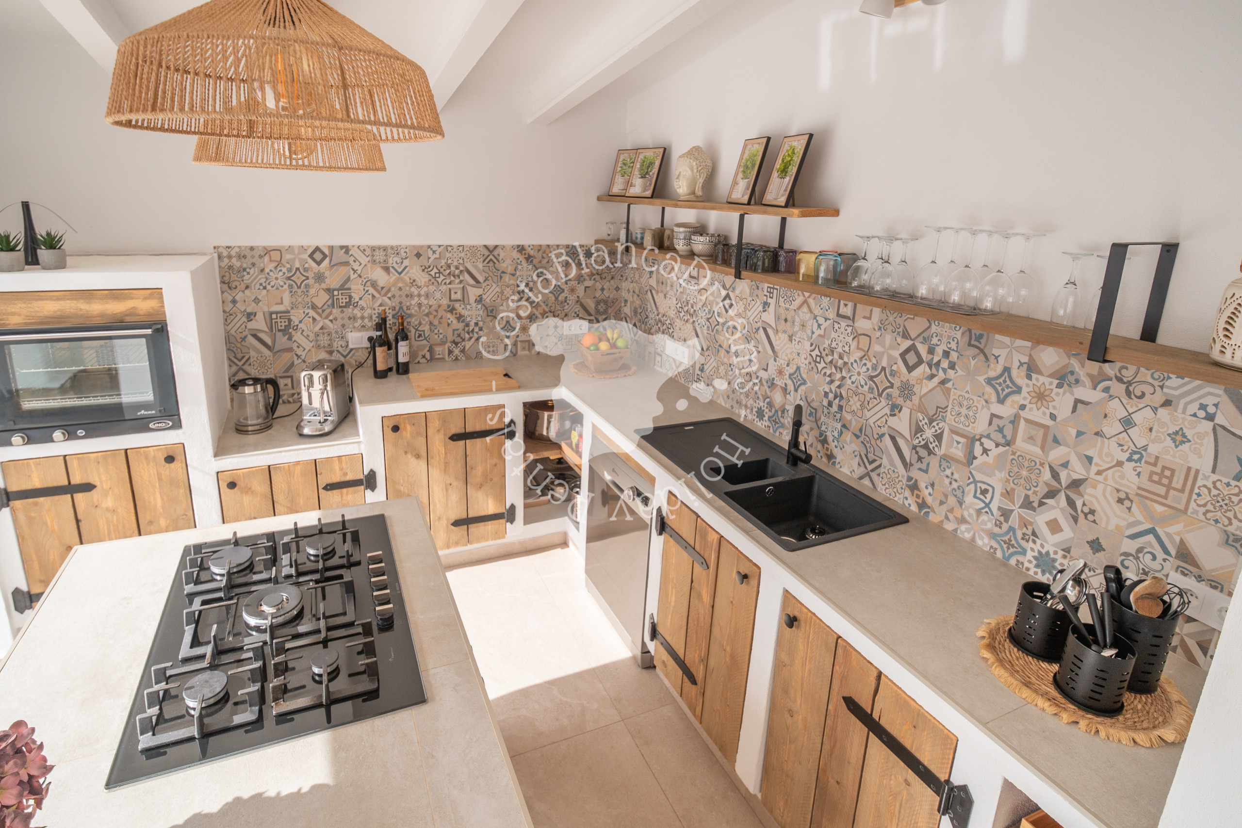 Dès votre arrivée, une allée privée vous accueille par un portail d'entrée, offrant un parking pour 2 à 3 voitures. Entrez et soyez accueilli par un couloir chaleureux et accueillant, vous menant au cœur de la maison. À votre droite, découvrez une cuisine américaine entièrement équipée avec des équipements modernes dont un réfrigérateur, un congélateur, un four, un lave-vaisselle, une machine à café, une bouilloire et un grille-pain. A côté se trouve la salle à manger, équipée de la climatisation et qui se fond harmonieusement dans le salon spacieux. Orné de beaux hauts plafonds et de poutres rustiques, le salon offre un canapé d'angle confortable, une Smart TV et un accès direct à la terrasse couverte. Et vous pouvez rester connecté grâce au Wi-Fi gratuit.