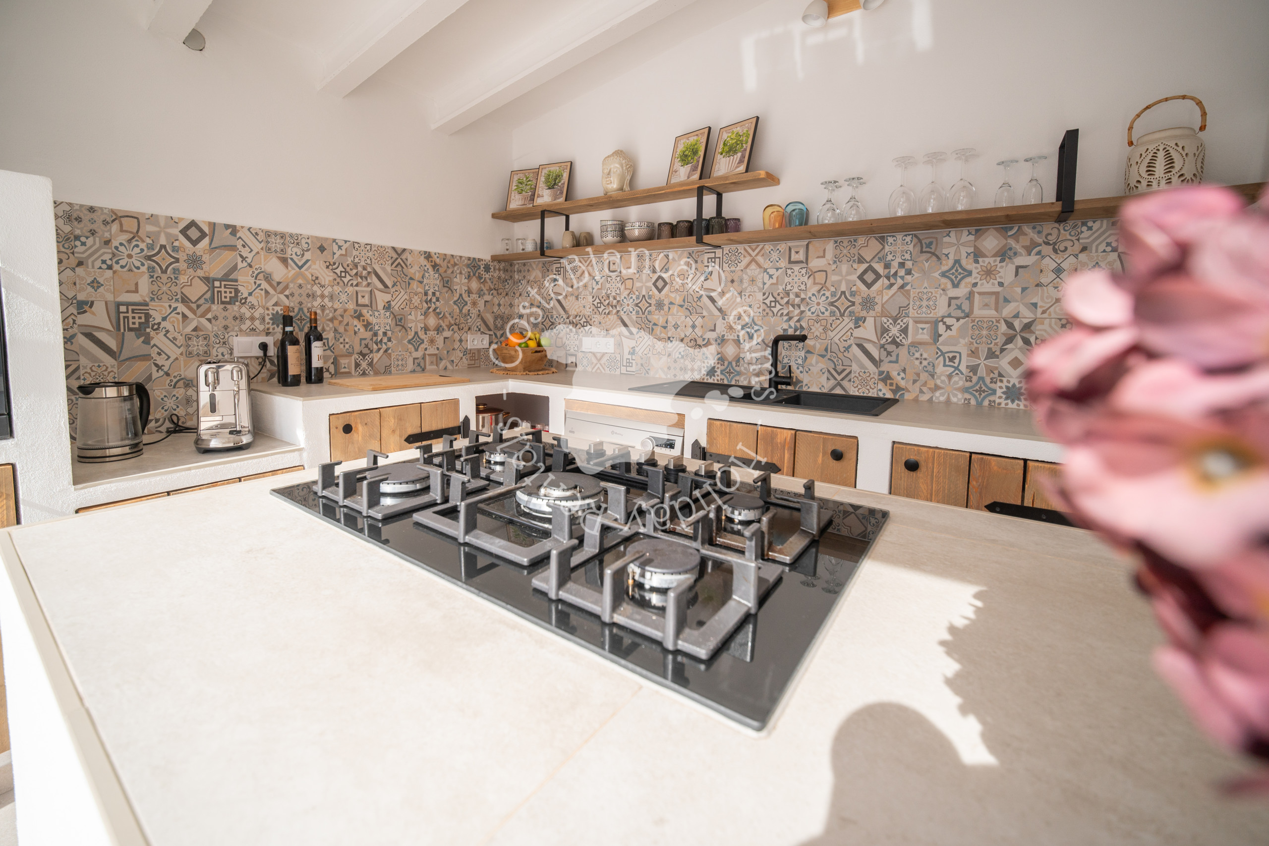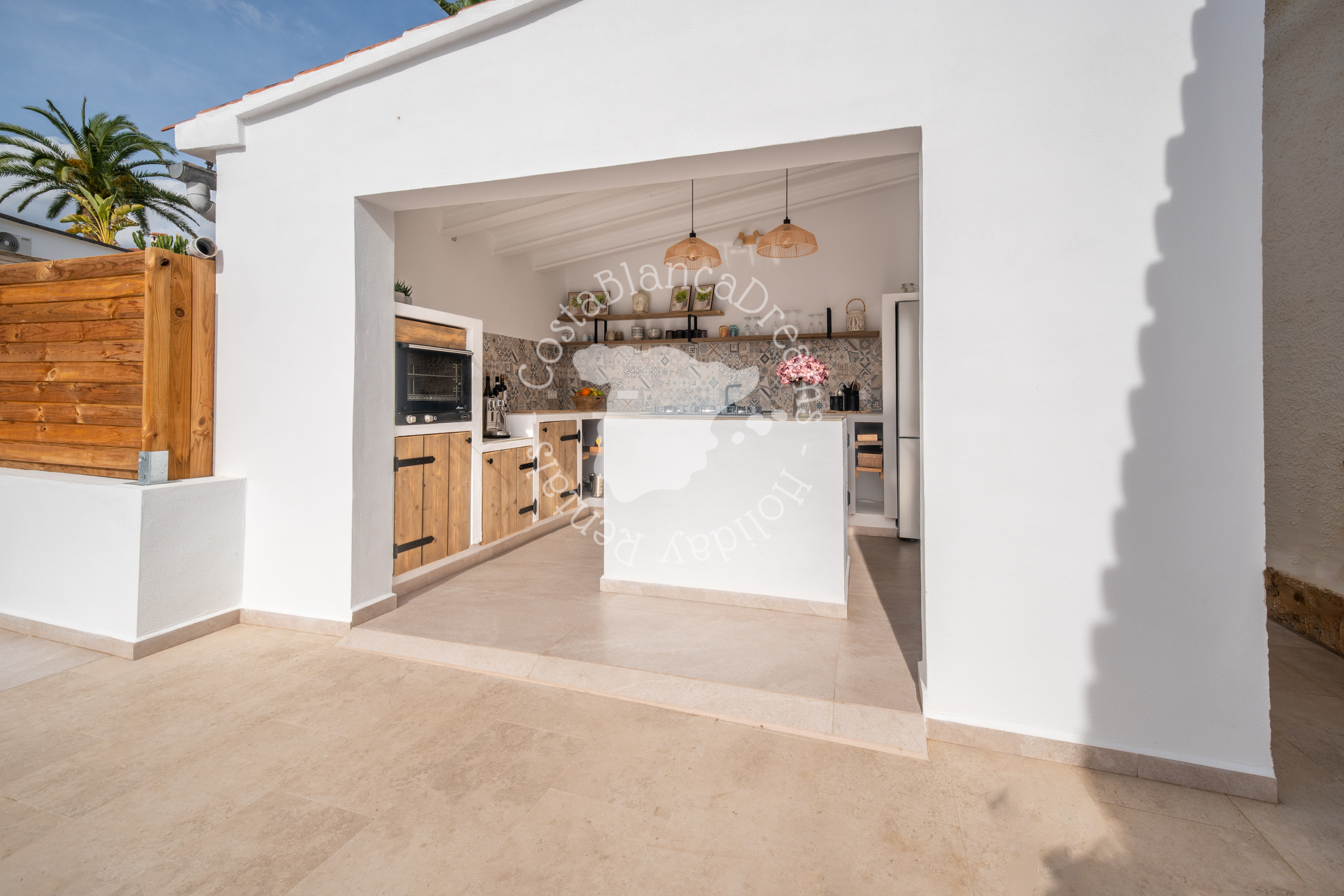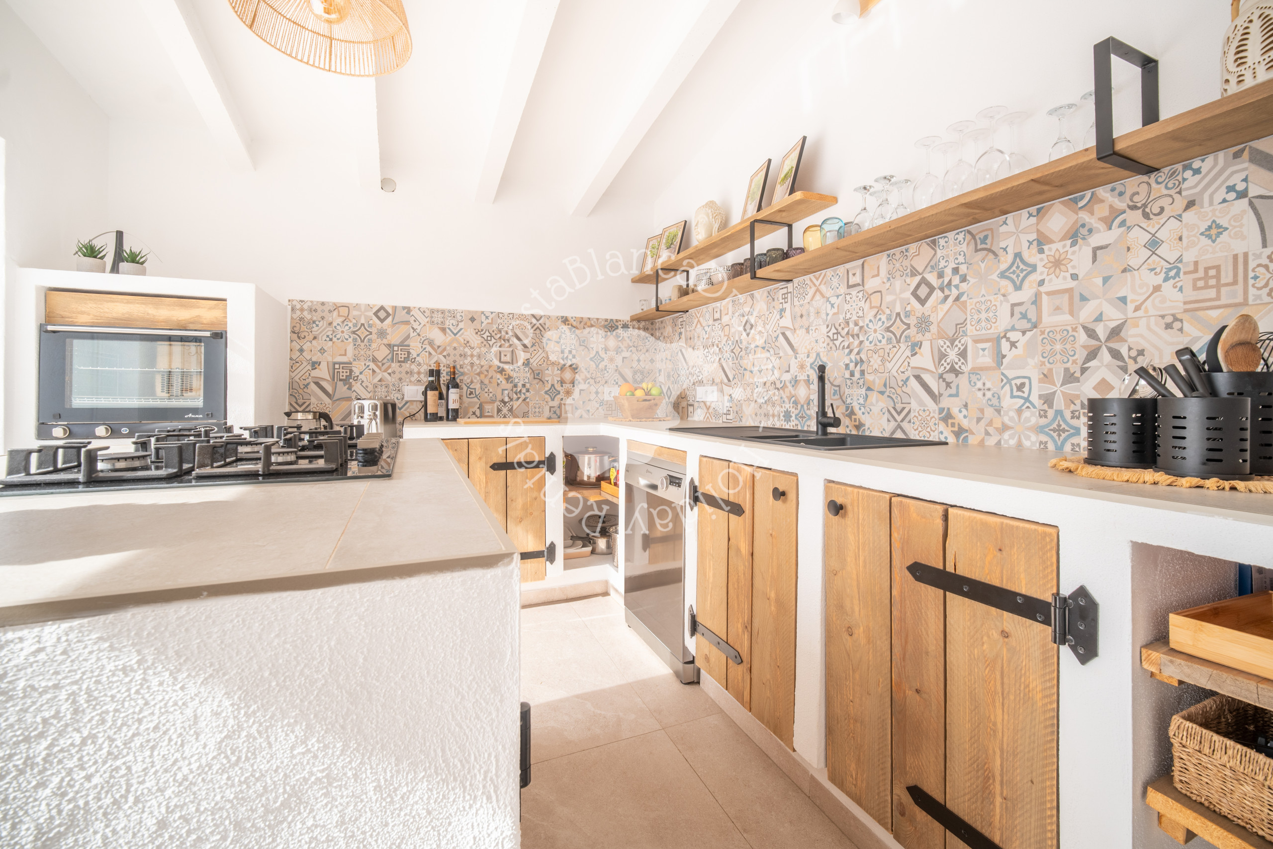 Dès votre arrivée, une allée privée vous accueille par un portail d'entrée, offrant un parking pour 2 à 3 voitures. Entrez et soyez accueilli par un couloir chaleureux et accueillant, vous menant au cœur de la maison. À votre droite, découvrez une cuisine américaine entièrement équipée avec des équipements modernes dont un réfrigérateur, un congélateur, un four, un lave-vaisselle, une machine à café, une bouilloire et un grille-pain. A côté se trouve la salle à manger, équipée de la climatisation et qui se fond harmonieusement dans le salon spacieux. Orné de beaux hauts plafonds et de poutres rustiques, le salon offre un canapé d'angle confortable, une Smart TV et un accès direct à la terrasse couverte. Et vous pouvez rester connecté grâce au Wi-Fi gratuit.