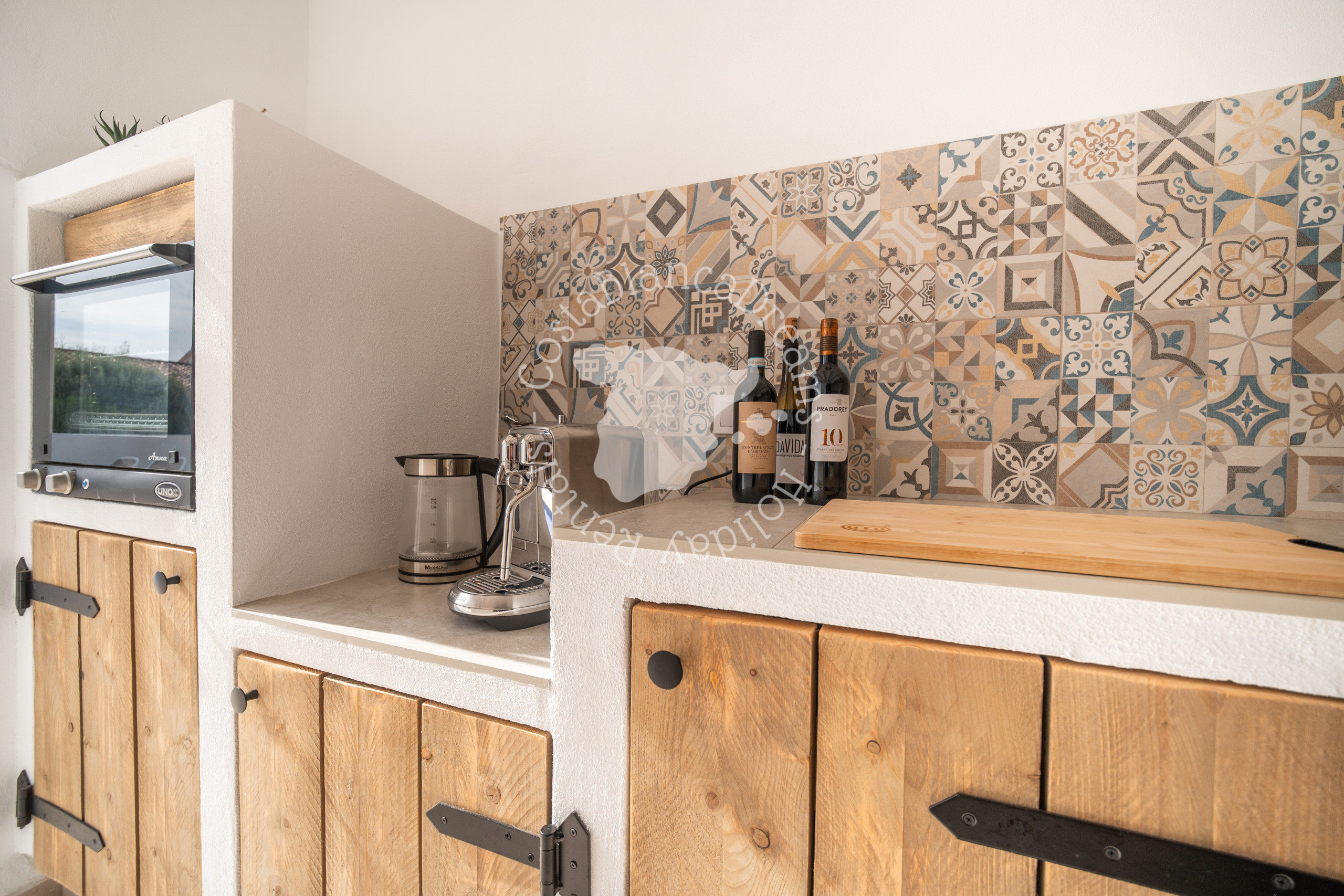 À l'intérieur, la villa offre un coin repas lumineux et accueillant avec des fenêtres coulissantes, vous donnant la sensation de dîner à l'extérieur tout en profitant de la vue sur la piscine. Le salon adjacent comprend un canapé confortable, une chaise et une télévision (avec Google Chrome), tandis qu'un petit coin salon à côté de la cuisine offre un coin extra confortable pour se détendre. La cuisine entièrement équipée comprend un réfrigérateur, un congélateur, un four, un micro-ondes, une plaque de cuisson à gaz à quatre zones, un lave-vaisselle, une machine à café Nespresso, un grille-pain et une bouilloire.