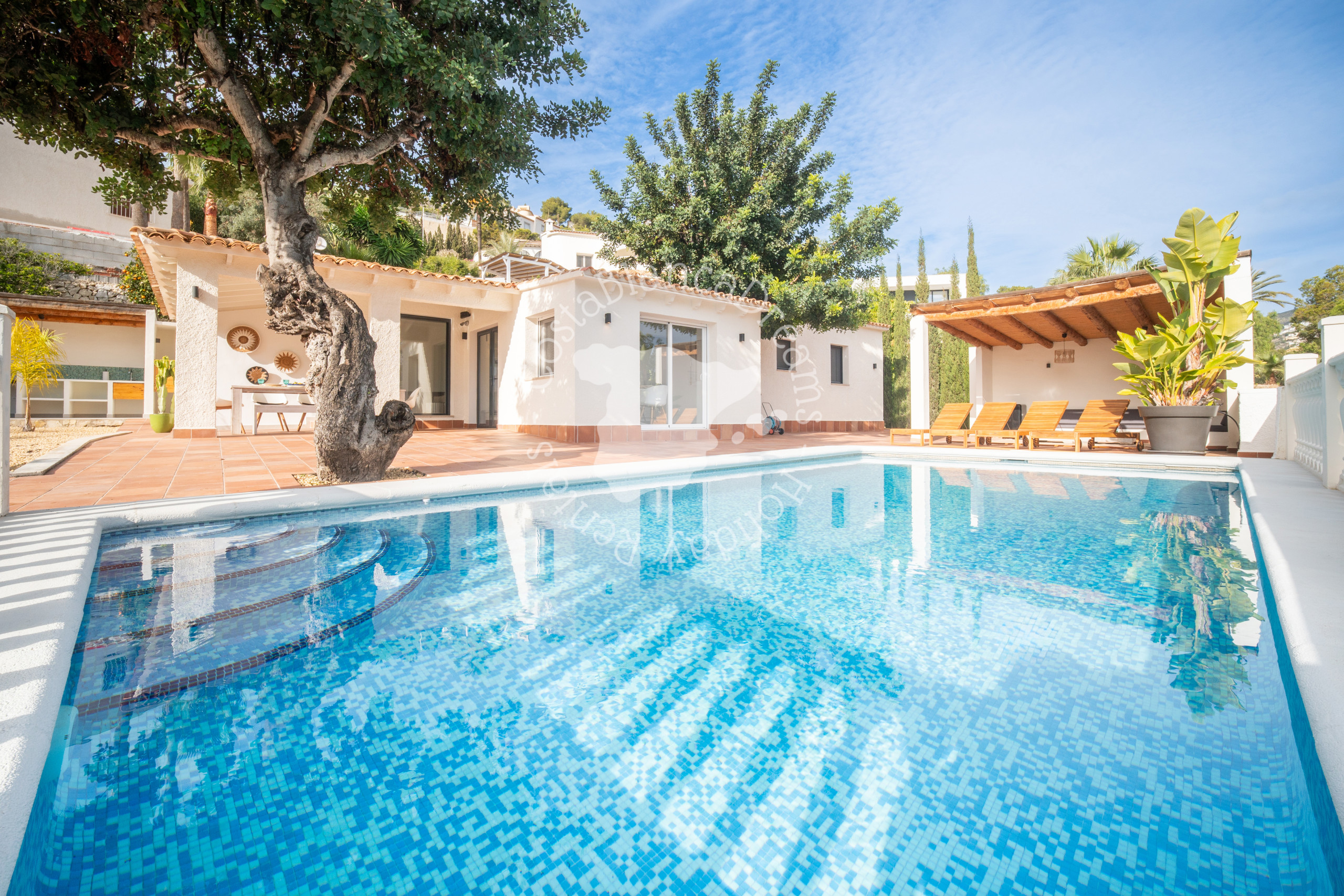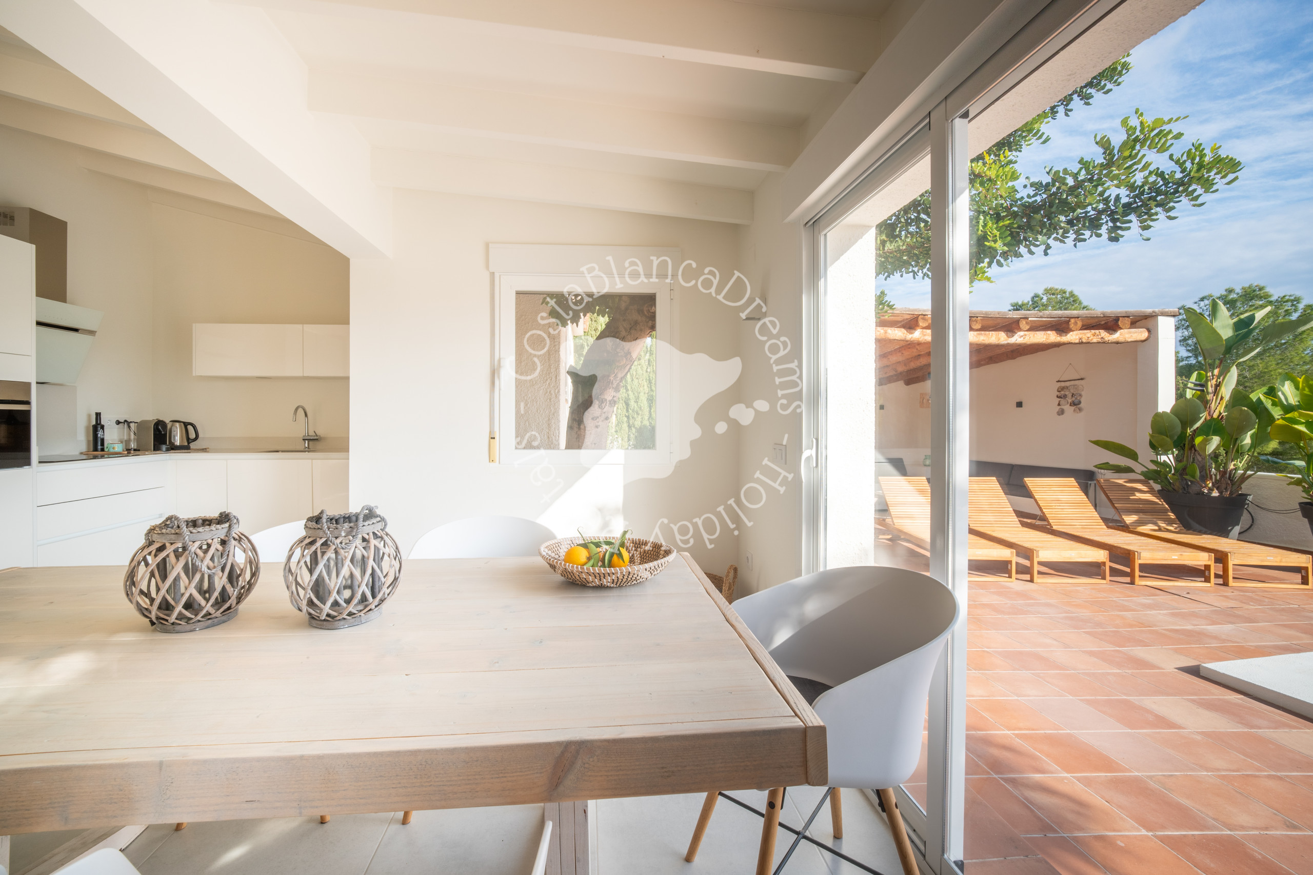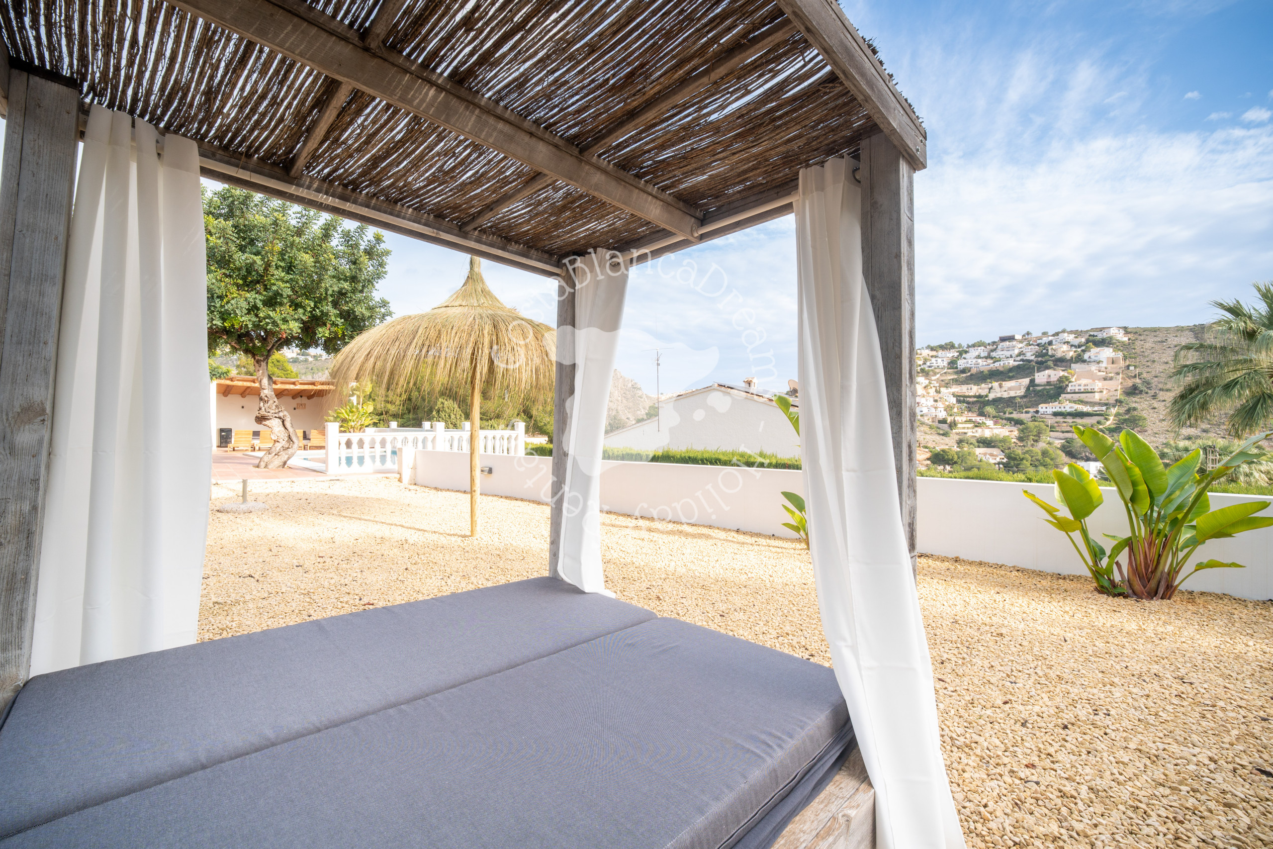 À l’extérieur, Casa Amahle se distingue par son très vaste jardin magnifiquement entretenu et ses vues dégagées sur les environs, sur le Cap d’Or avec sa tour, ainsi qu’un petit aperçu sur la mer et la baie d’El Portet. Les hôtes peuvent profiter pleinement de la vie en plein air grâce à un espace repas couvert et à une cuisine extérieure de style ibizien, équipée d’un barbecue à gaz Weber et d’un évier. La piscine privée mesure 8 x 4 mètres et peut être chauffée sur demande (voir détails ci-dessous). La douche extérieure est idéale pour se rincer après une journée ensoleillée à la plage. La piscine est entourée de transats, parfaits pour se détendre sous le soleil méditerranéen. À côté de la piscine, une naya couverte de style ibizien avec deux confortables canapés lounge et un petit réfrigérateur offre un agréable espace ombragé avec vue sur la piscine et le jardin. De plus, un lit de repos confortable et des canapés lounge supplémentaires sont judicieusement disposés afin que les hôtes puissent pleinement profiter du confort et de la beauté des lieux.