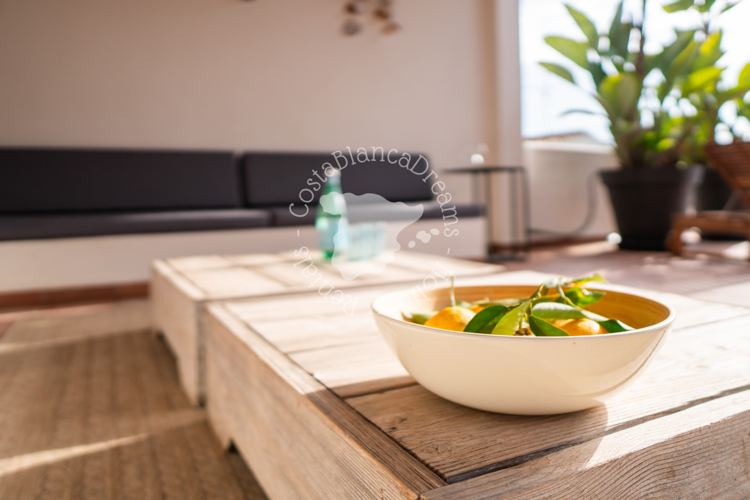 L'étage principal supérieur vous accueille avec un salon lumineux doté de canapés confortables, offrant une vue panoramique sur la mer et un espace bureau séparé. Détendez-vous dans le salon confortable doté de Smart TV, sur lequel vous pouvez utiliser votre propre compte Netflix, regarder la télévision par satellite allemande et les chaînes espagnoles. Ou sortez sur la terrasse semi-couverte, où vous pourrez dîner tout en admirant la vue fascinante sur la mer et la vallée.
