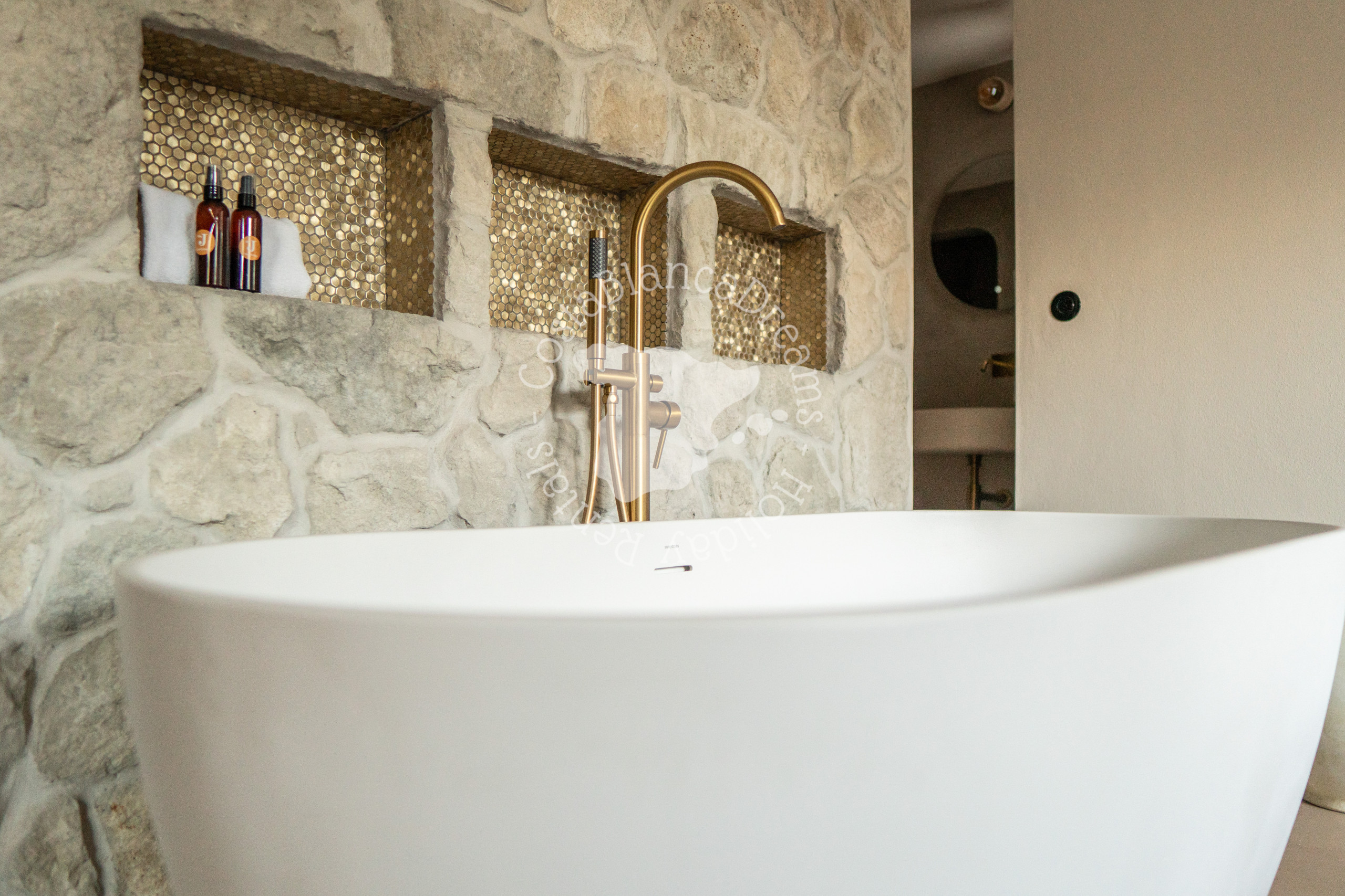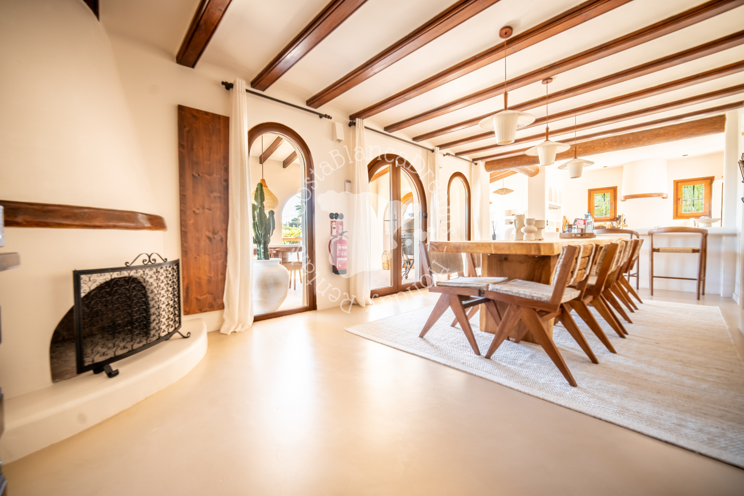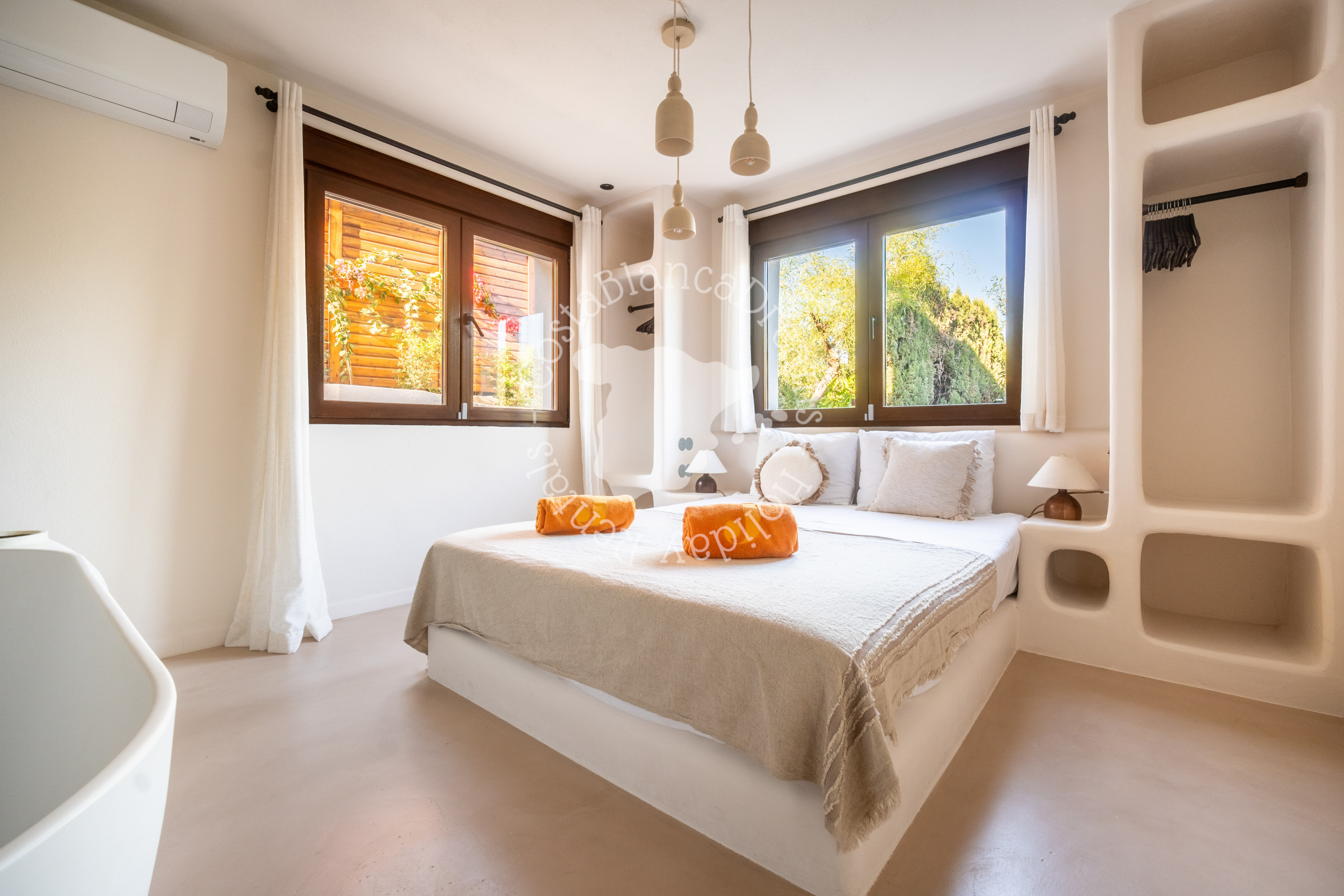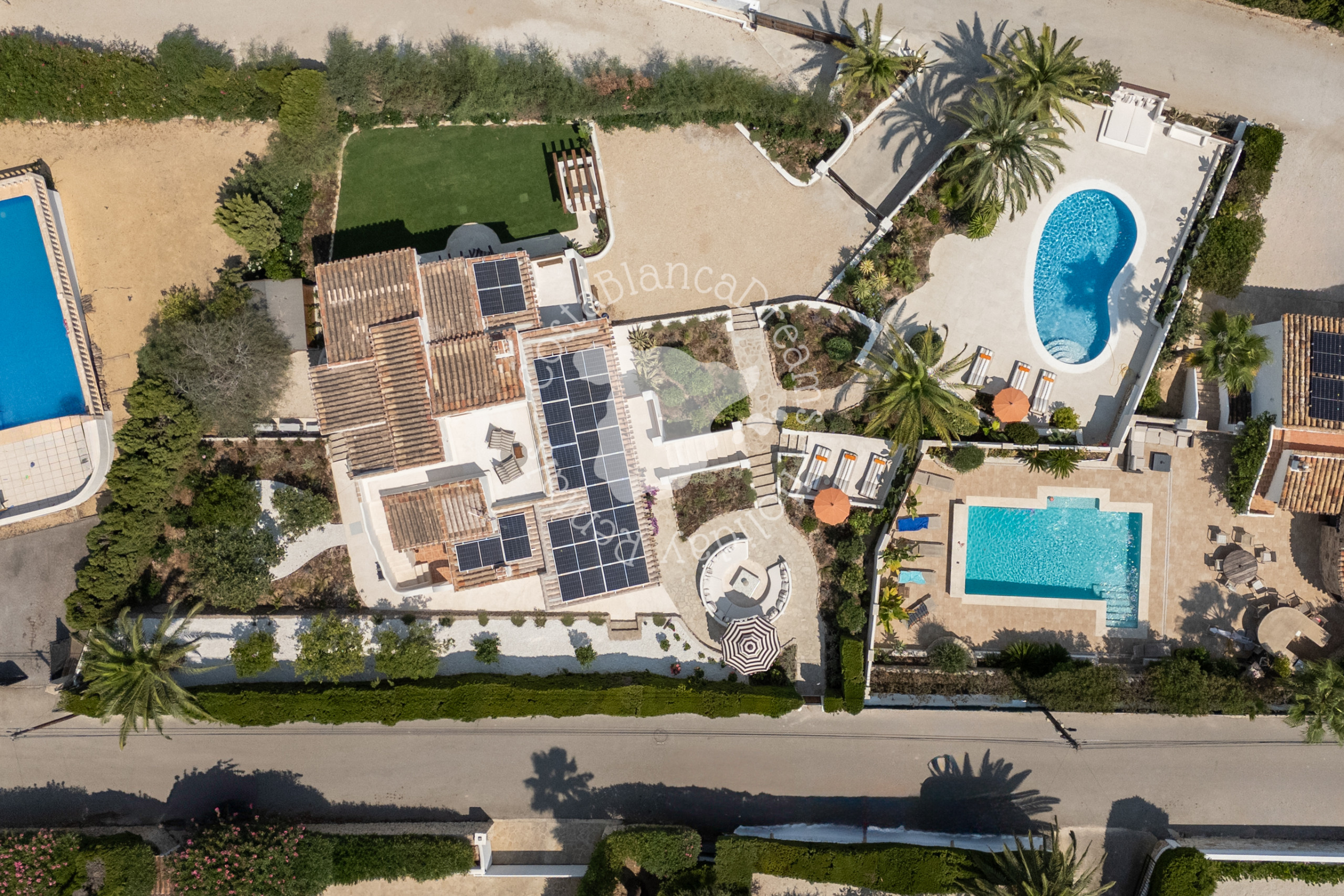 Outside you’ll discover a lush, Mediterranean-inspired garden complete with palm trees, cacti, and native flora. At its heart is a 9x5-meter swimming pool (heating available on request - see details below), bordered by sun loungers and tranquil chill-out zones. Unwind on the sunken round sofa, perfect for relaxed evenings under the stars, or host intimate gatherings under the romantic gazebo, which can even be used for small wedding ceremonies.