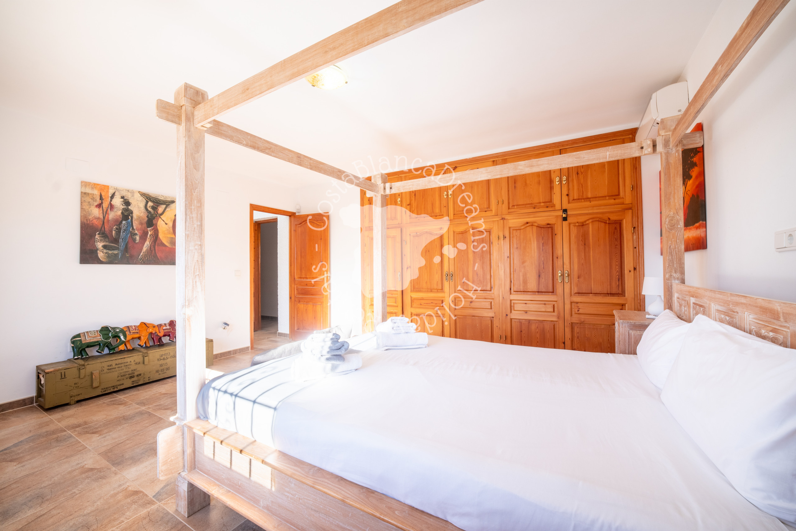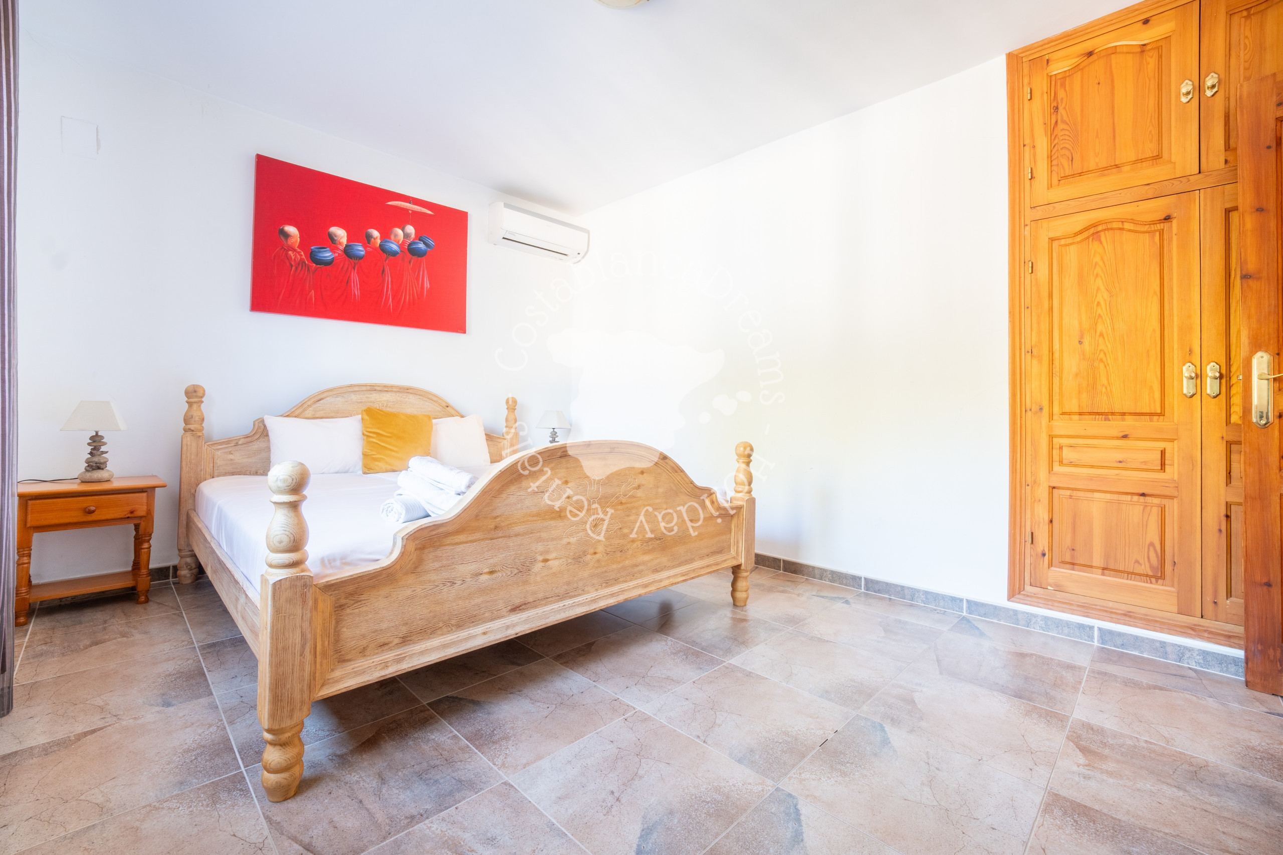 As you arrive, a private driveway welcomes you through a gated entrance, providing parking for 2 to 3 cars. Step inside and be greeted by a warm and inviting hallway, leading you to the heart of the home. To your right, discover a fully equipped open-plan kitchen with modern amenities including a fridge, freezer, oven, dishwasher, coffee machine, water kettle, and toaster. Adjacent lies the dining area, complete with air conditioning and seamlessly flowing into the spacious living room. Adorned with beautiful high ceilings and rustic beams, the living room offers a cozy corner sofa, Smart TV, and direct access to the covered terrace. And you can stay connected with complimentary WiFi.