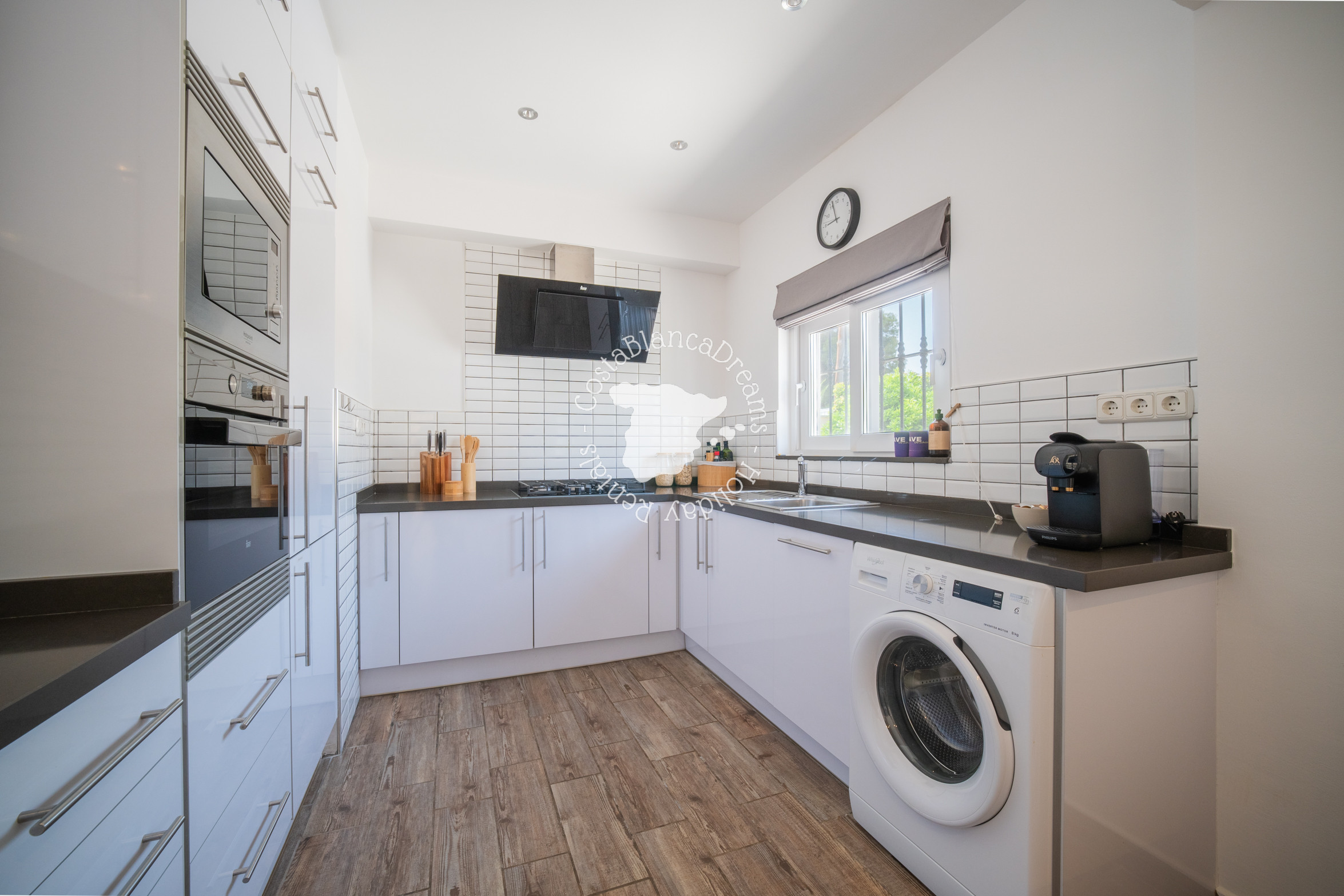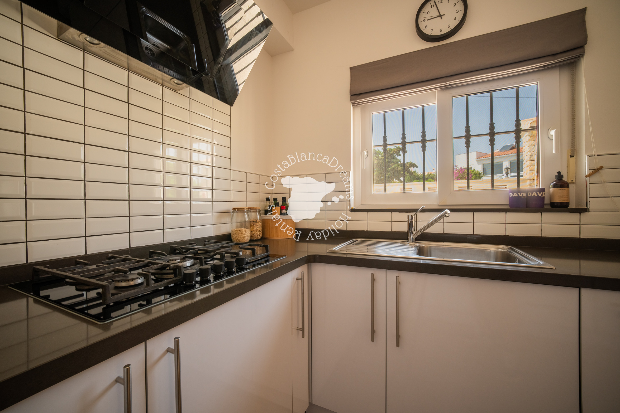 Outside, discover your own paradise amidst a beautiful Mediterranean garden. Lounge under the shaded naya, where a dining space awaits al fresco meals enjoyed against the backdrop of the serene surroundings. Fire up the gas BBQ for sizzling culinary delights, or bask in the Spanish sun on the loungers surrounding your private pool (can be heated on request, see below). An outdoor shower offers refreshment after a leisurely swim, completing the ultimate outdoor living experience.