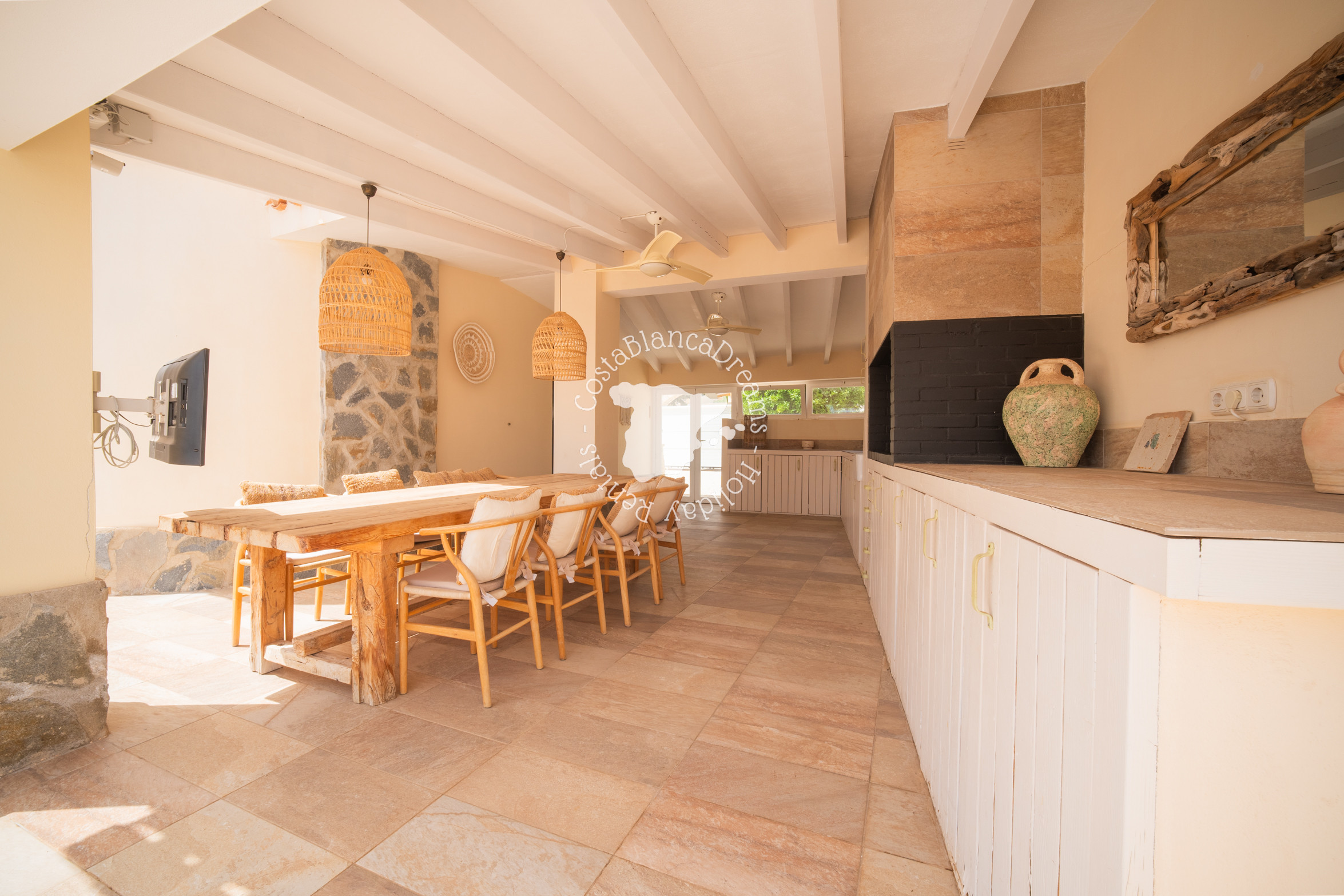 Step into the inviting living room, adorned with Ibiza-style decor and flooded with natural light. Sink into plush sofas or lounge in the cozy chairs as you catch up on your favorite shows on the TV. Adjacent, a dining table set for six invites leisurely meals with loved ones, while direct access to the garden seamlessly merges indoor and outdoor living.