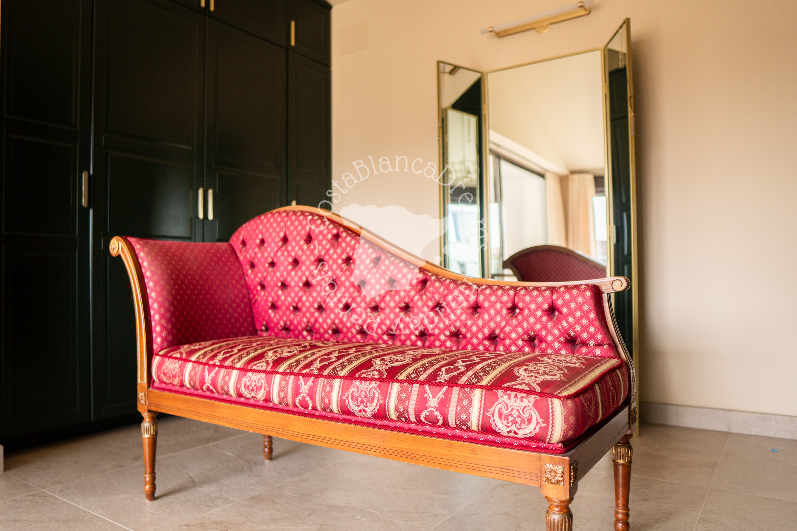 As you arrive, you'll find an extensive driveway with parking for at least 6 cars. Enter the villa through the grand hall. To the right, you'll be captivated by the expansive, open-plan living area with soaring ceilings and floor-to-ceiling windows spanning two floors. The large glass surfaces and open spaces create a bright and airy atmosphere throughout the property. The living space is elegantly furnished with Italian design pieces, including a large dining table for 8, a 3-seat comfortable sofa, a 1-seat chaise longue, and a 75-inch Samsung ‘The Frame’ smart TV.